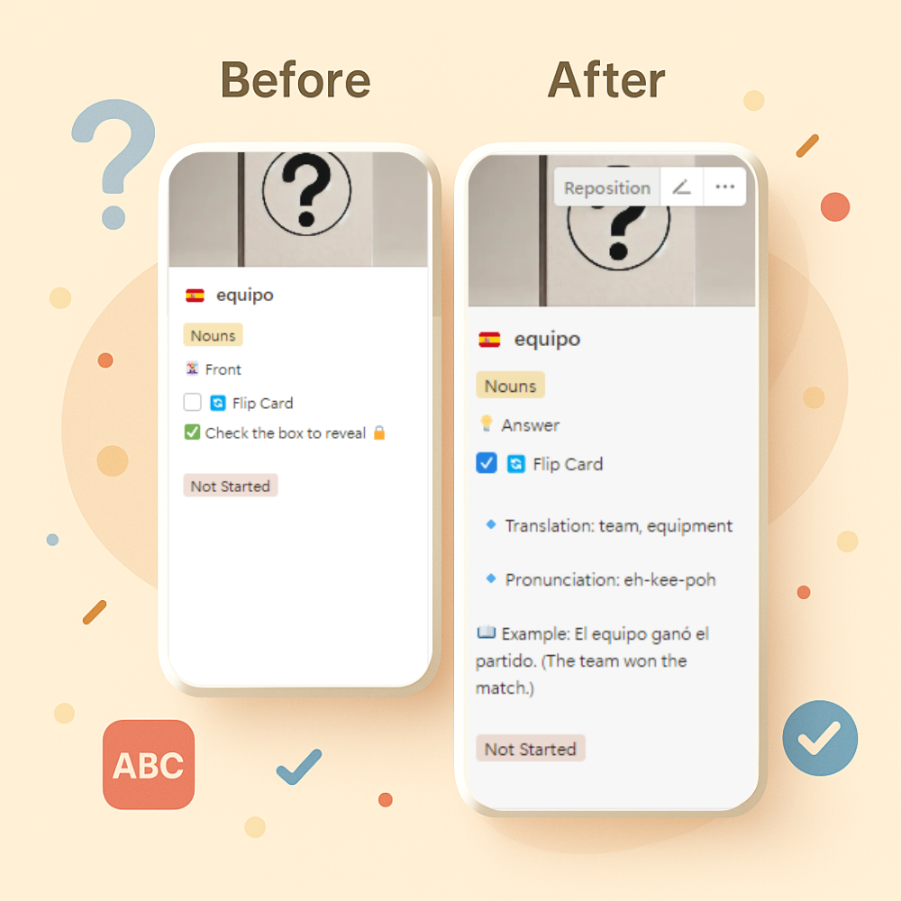 After taking Spanish classes, I realized my vocabulary was filled with words I didn’t need — while I struggled to recall the ones I heard every day. So I did what any frustrated learner might do (who is a Notion fan): I built my own system.
