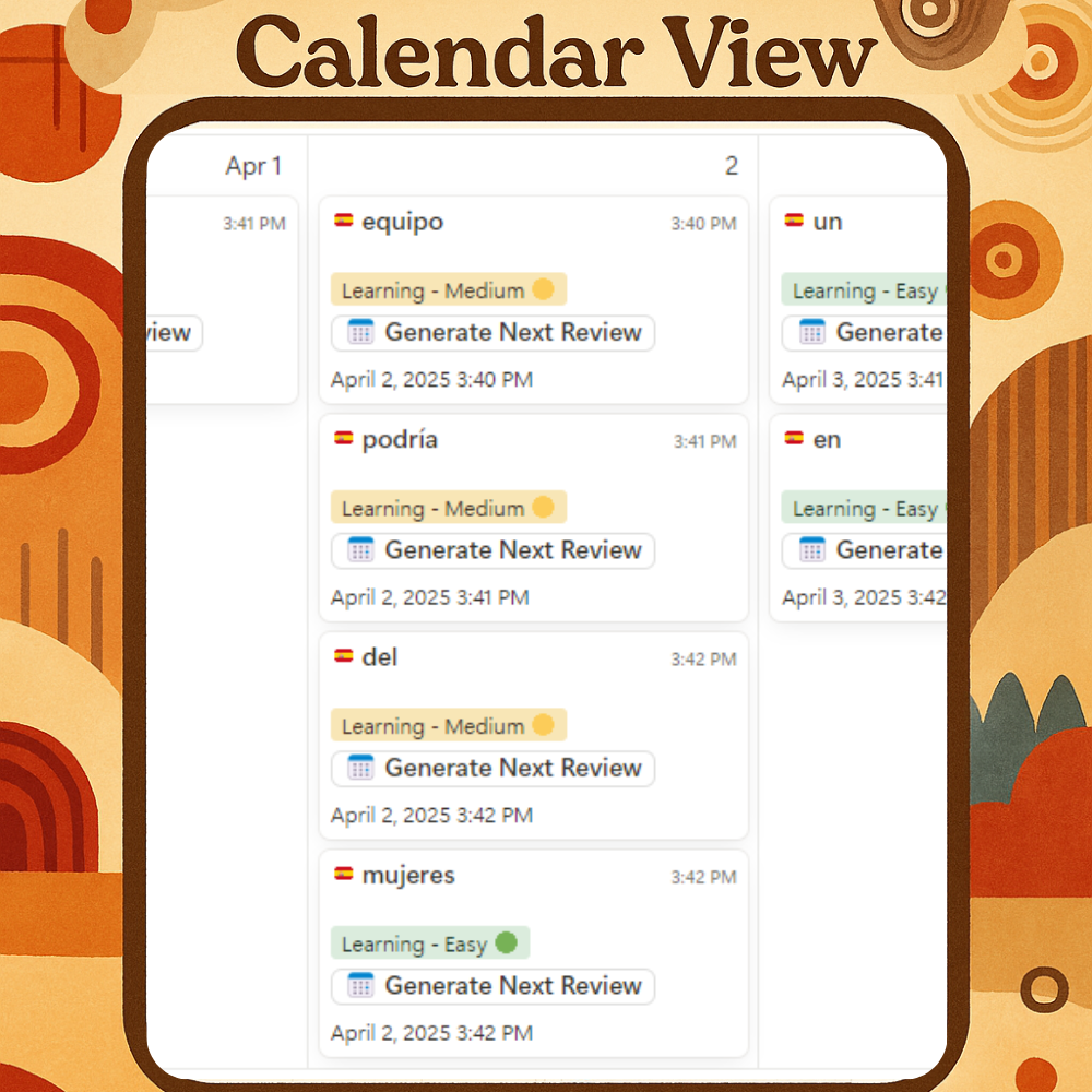 This tracker starts with the 300 most frequently used Spanish words, so you learn what's relevant right away. From there, you use a flashcard-based system with smart scheduling and progress tracking — all inside Notion.